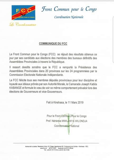 Dans un communiqué publié tard dans la soirée, le coordonnateur du FCC, Néhémie Mwilanya félicite les députés provinciaux pour cette victoire, une preuve de loyauté à Joseph Kabila, le président sortant.