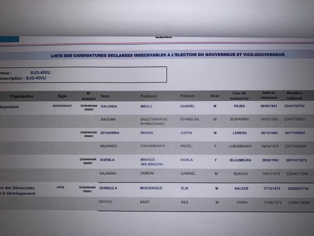 La Commission électorale nationale indépendante (CENI) a rendu publique la liste des candidats en course pour les élections des gouverneurs et vice-gouverneurs prévue en mars prochain. Sur une liste consultée par la rédaction de Kivuavenir.com, quatre candidatures viennent d’être déclarées irrecevables dans la province du Sud-Kivu.