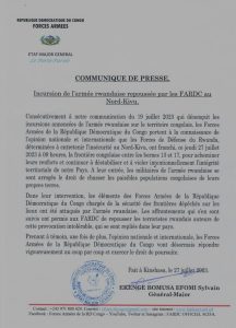 Cette annonce est contenue dans un communiqué des FARDC consécutivement à une nouvelle incursion de l’armée rwandaise, jeudi 27 juillet 2023 à 9heures, à la frontière congolaise entre les bornes 13 et 17. D’après le communiqué, les Forces armées de la République démocratique du Congo ont repoussé les ennemis jusqu’à replier chez eux au Rwanda.
