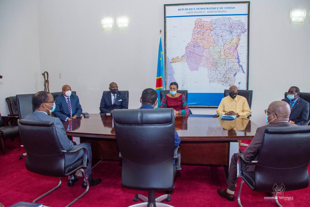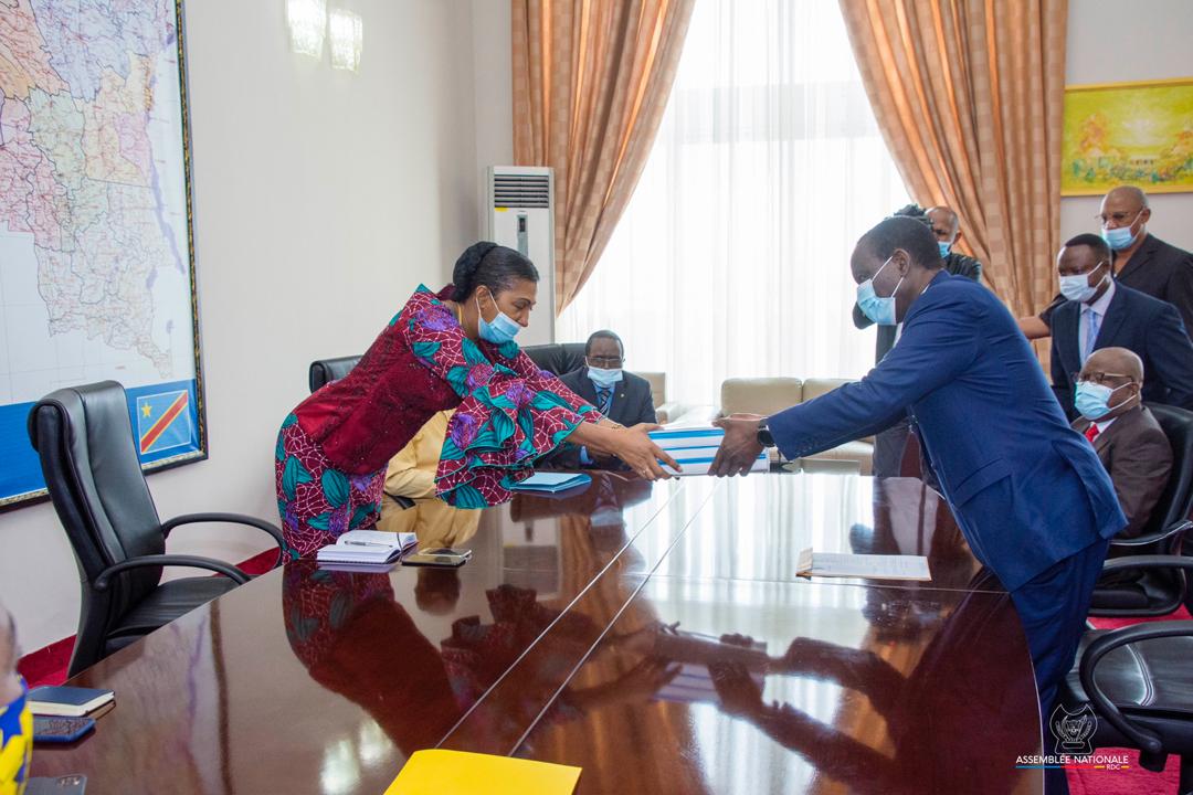 Photo : Le premier ministre Sylvestre Ilunga Ilunkamba et sa delegation dans le bureau du présidente de l’Assemblée Nationale Jeanine Mabunda pour le dépôt du projet de budget 2021 .