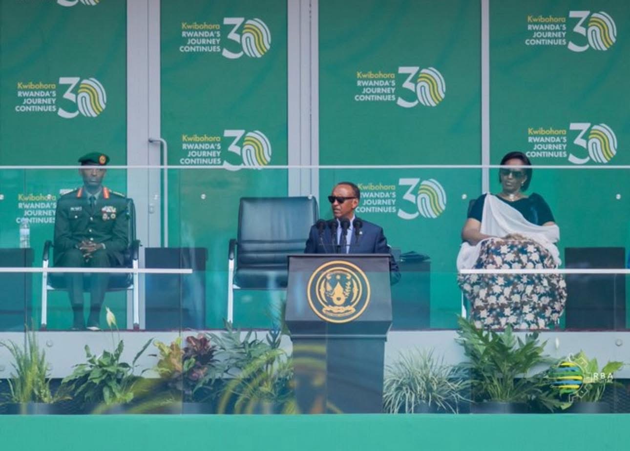 Le président rwandais prononce un discours lors de la cérémonie officielle marquant le 30e anniversaire de la libération du Rwanda, sous le slogan “Kwibohora 30 – Rwanda’s Journey Continues”, en présence de la Première Dame et d’un haut responsable militaire, à Kigali.